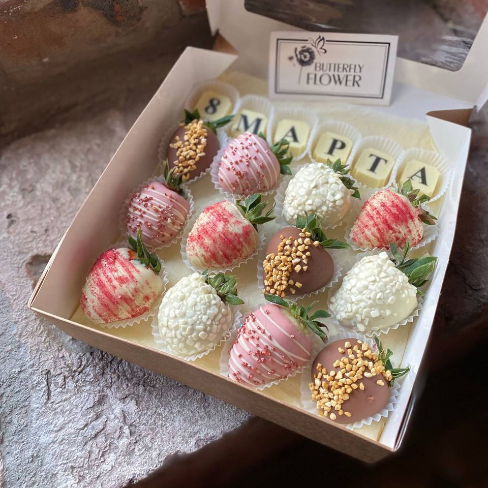 Композиция из клубники в шоколаде в дизайнерской коробке