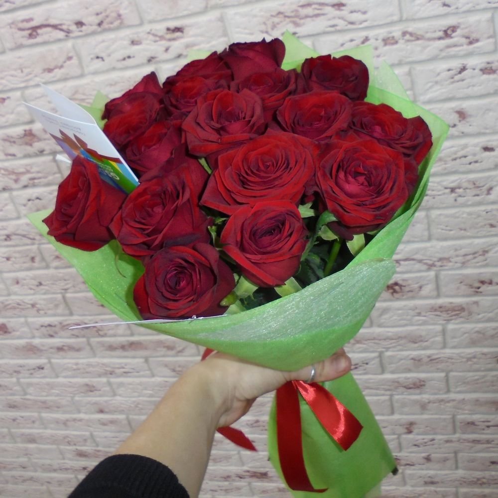 Классический букет из 17 бордовых российских роз, упакованный и украшенный атласным бантиком. Универсальный букет для подарка как мужчине, так и женщине.