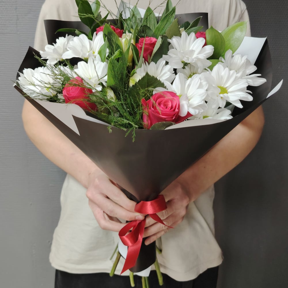 Роза малиновая 5 шт Хризантема кустовая 2 шт Альстромерия 2 шт Триферн 2 шт Рускус 2 шт Чёрно белая упаковка