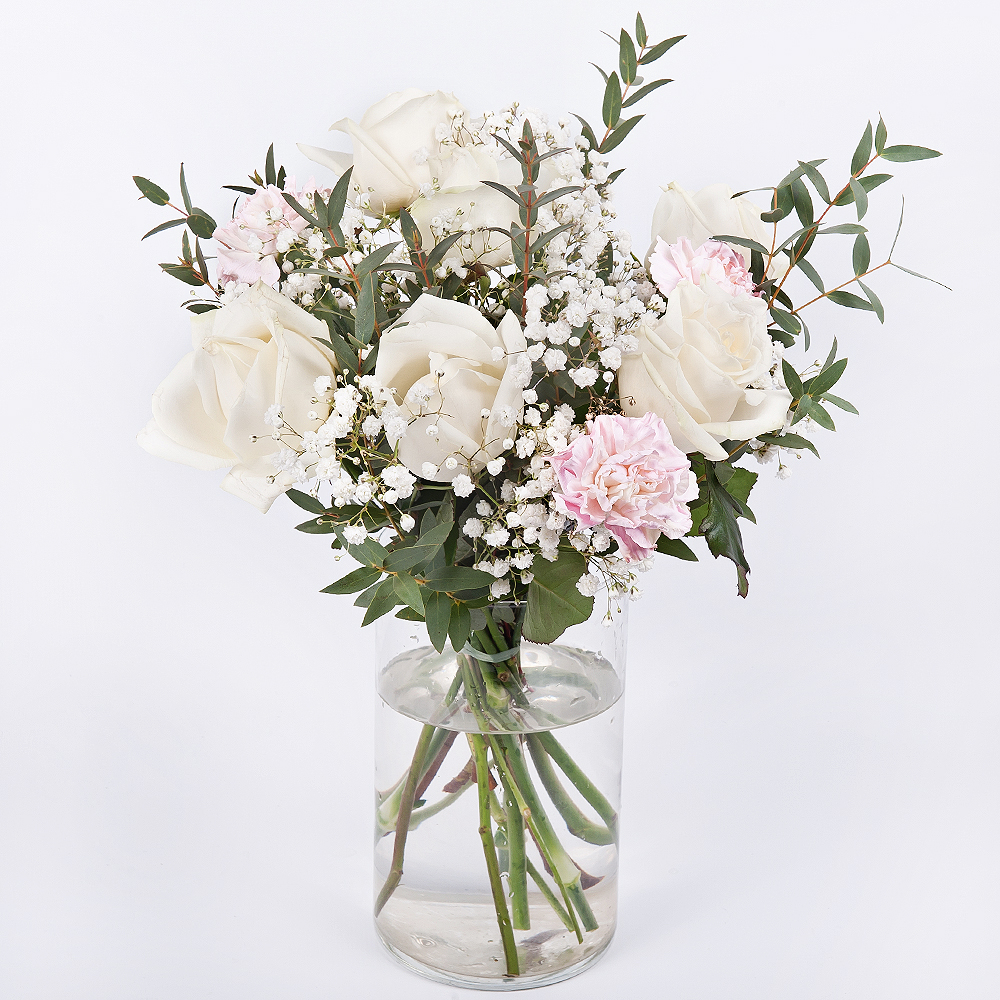 Насладитесь спокойствием этого чистого букета, в котором представлены элегантные гвоздики, белые розы, неземная гипсофила и успокаивающий аромат эвкалипта парвифолия. Этот букет воплощает в себе сущность чистоты и покоя.