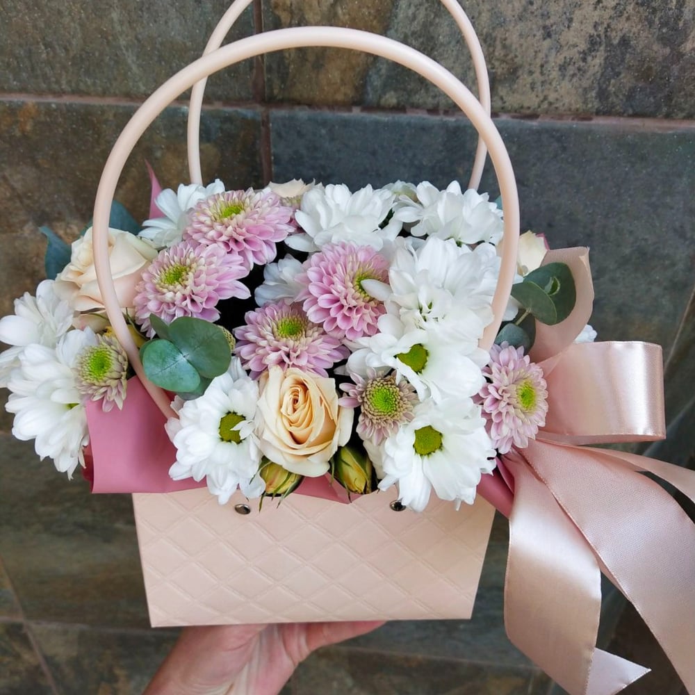 Коробка с цветами «Кремовая сумочка» из хризантем и роз