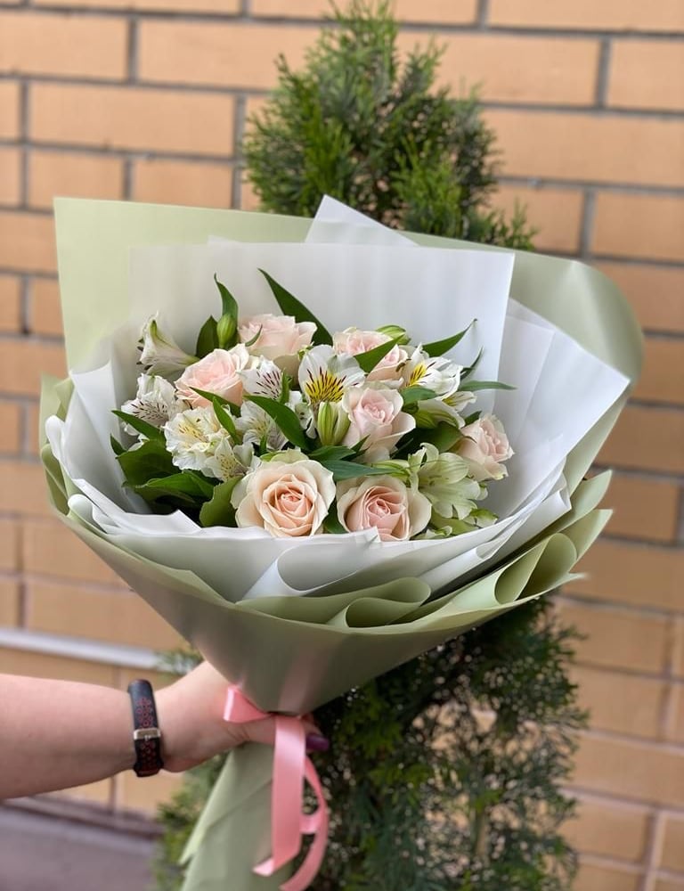 Букет «Кремовые розы и альстромерии»