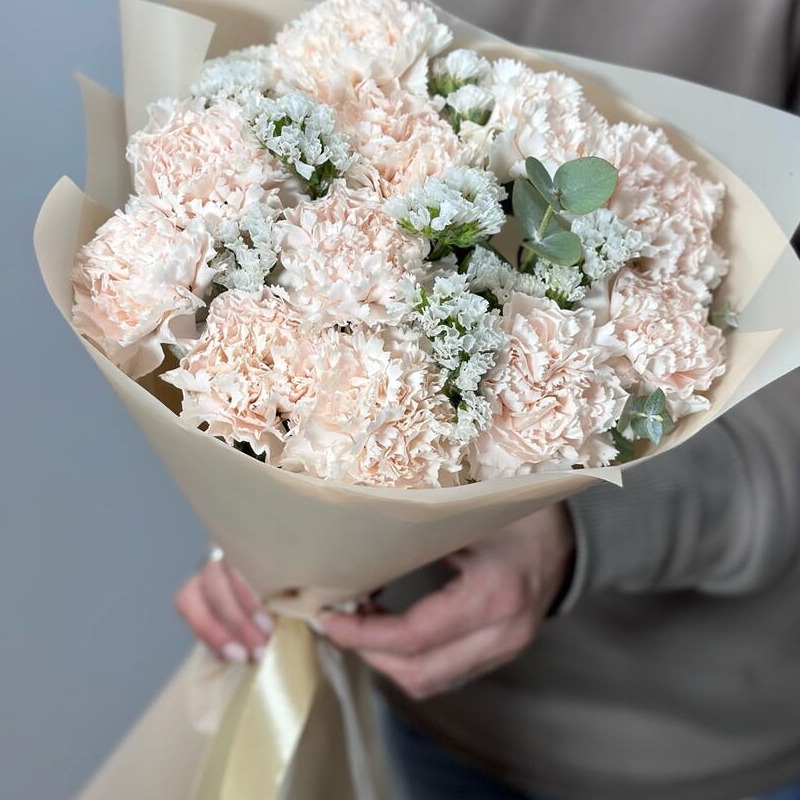 Букет «Кремовый диантус со статицей и эвкалипт» из гвоздик