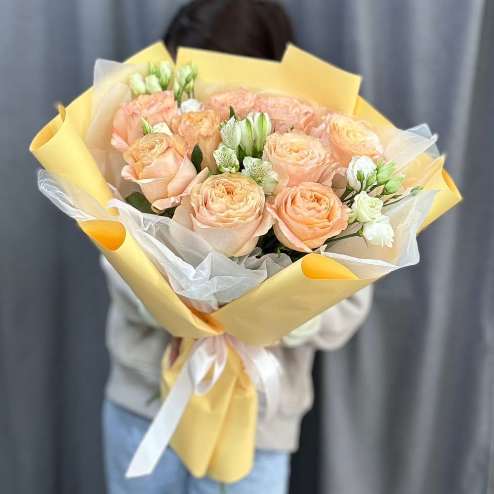Букет "Кремовый рассвет" состоит из пионовидных роз эквадор эустом, альстромерий оформленный в ярко-кремовую упаковку