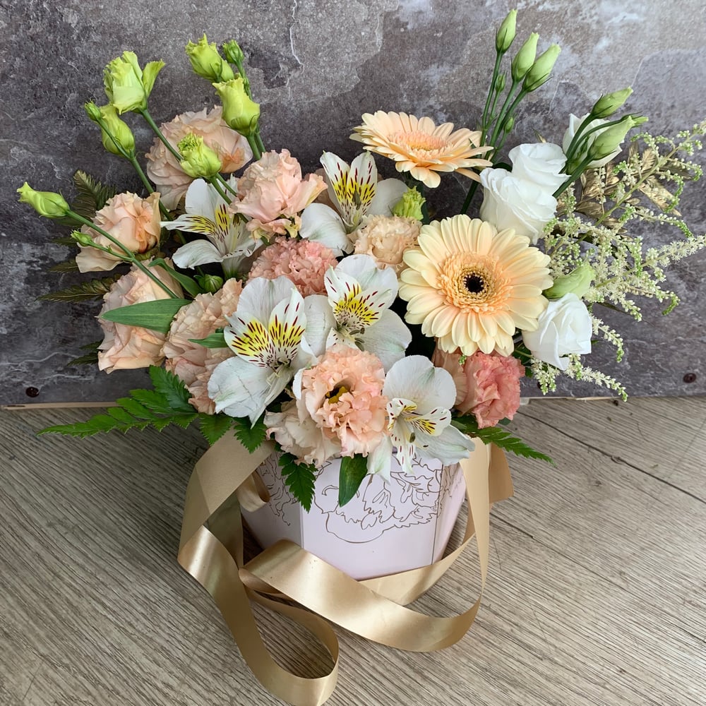 Коробка с цветами «Кремовый рай» из эустом и альстромерий