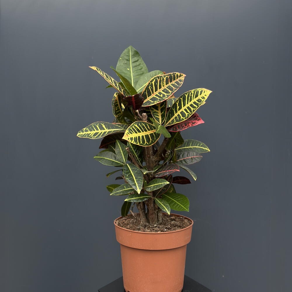 Кротон — вечнозелёное декоративное растение с яркими, пёстрыми листьями, которые могут быть зелёными, жёлтыми, оранжевыми, красными или с полосками. Он ценится за насыщенные цвета и необычную окрас...