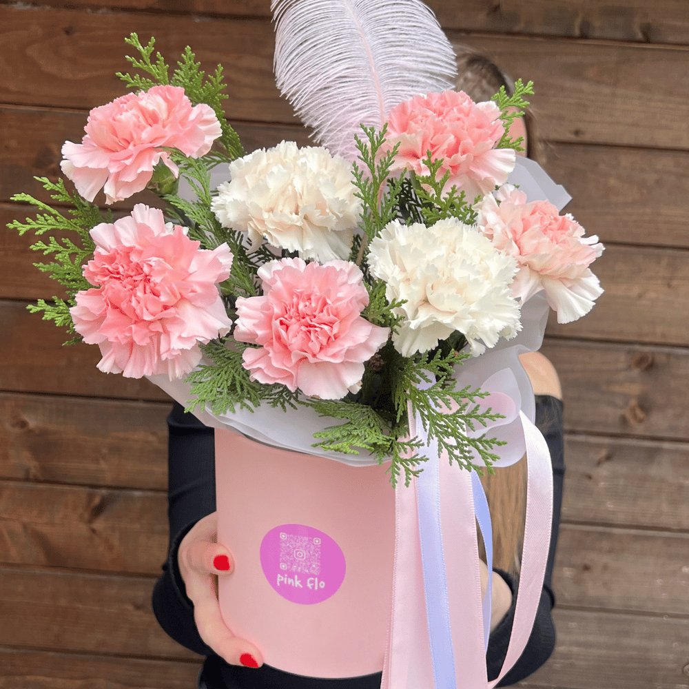 ✨ Композиция в шляпной коробке с диантусами и декоративным пером ✨ Лёгкая, изящная и с характером. Эта композиция — про внимание к деталям и тонкий вкус. Нежные диантусы символизируют заботу и иск…