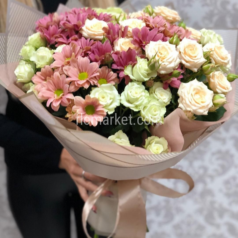 Нежный букет из кудрявых кустовых роз и ароматных хризантем.