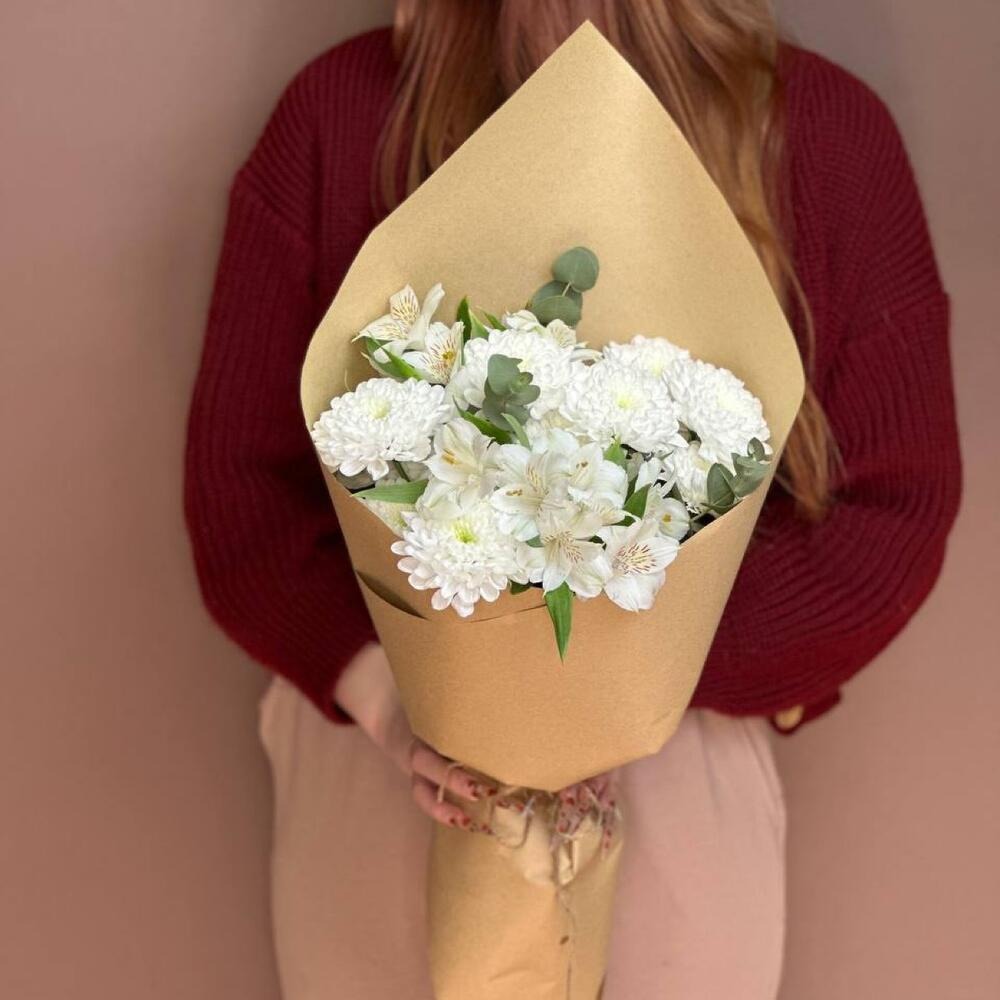 Изысканный кулёк из хризантем и альстромерий, упакованный в элегантную крафт упаковку. Хризантемы - символ тепла и долгожданного возвращения, а альстромерии принесут радость и уверенность в будущем.…
