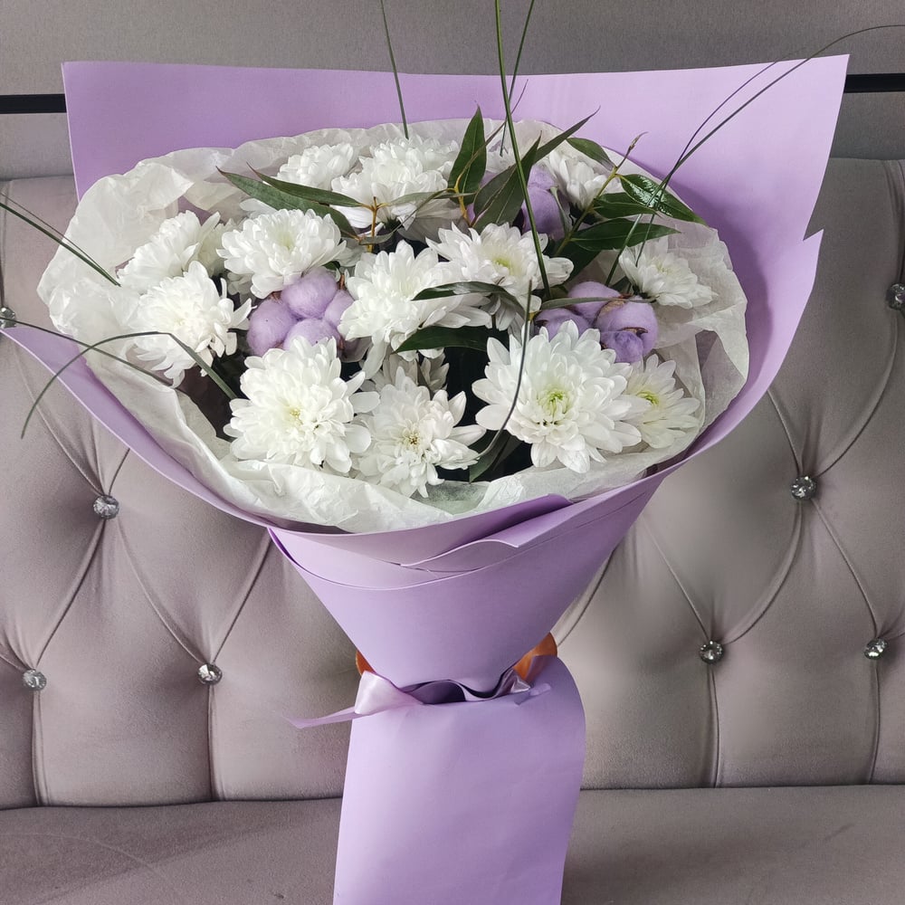 Нежный букет из кустовой хризантемы и фиолетового хлопка с добавлением ароматного эвкалипта.