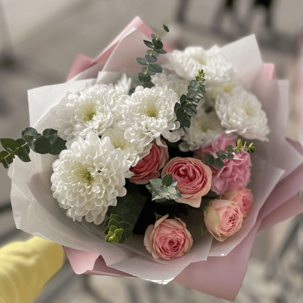 Букет «Кустовая роза хризантема гвоздика эвкали»