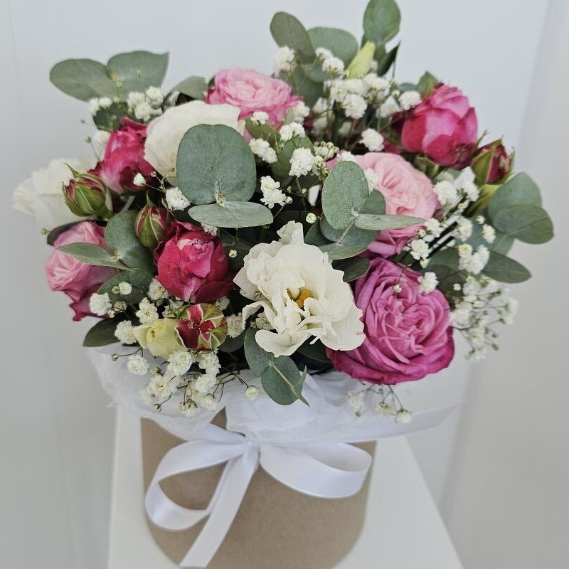 Букет «Кустовая роза и лизиантус в коробке»