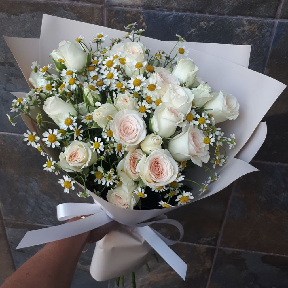 Букет из кустовой розы и ромашек подарит хорошее настроение и порадует любого получателя!
