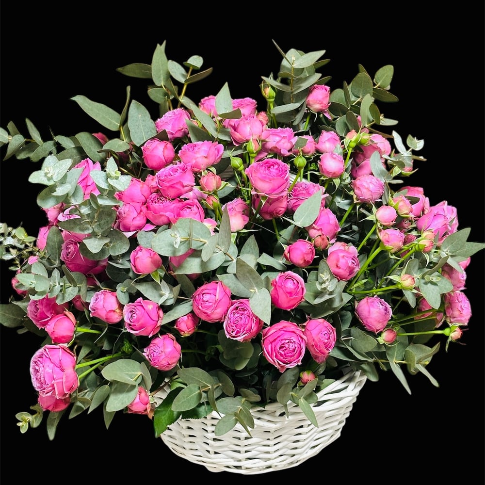 Роскошная корзина с яркими розовыми кустовыми розами и изящной зеленью эвкалипта. Эта композиция станет незабываемым подарком, который выражает нежность, заботу и восхищение. Идеально подходит для...