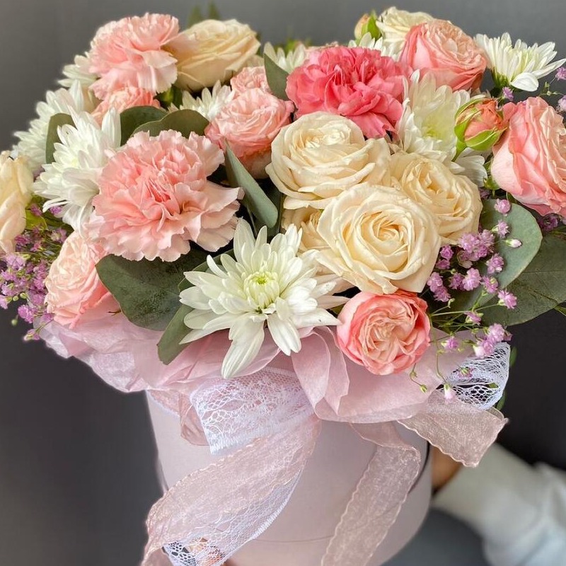 Шляпная коробка с цветами «Кустовые роз с диантусами и хризантемой»