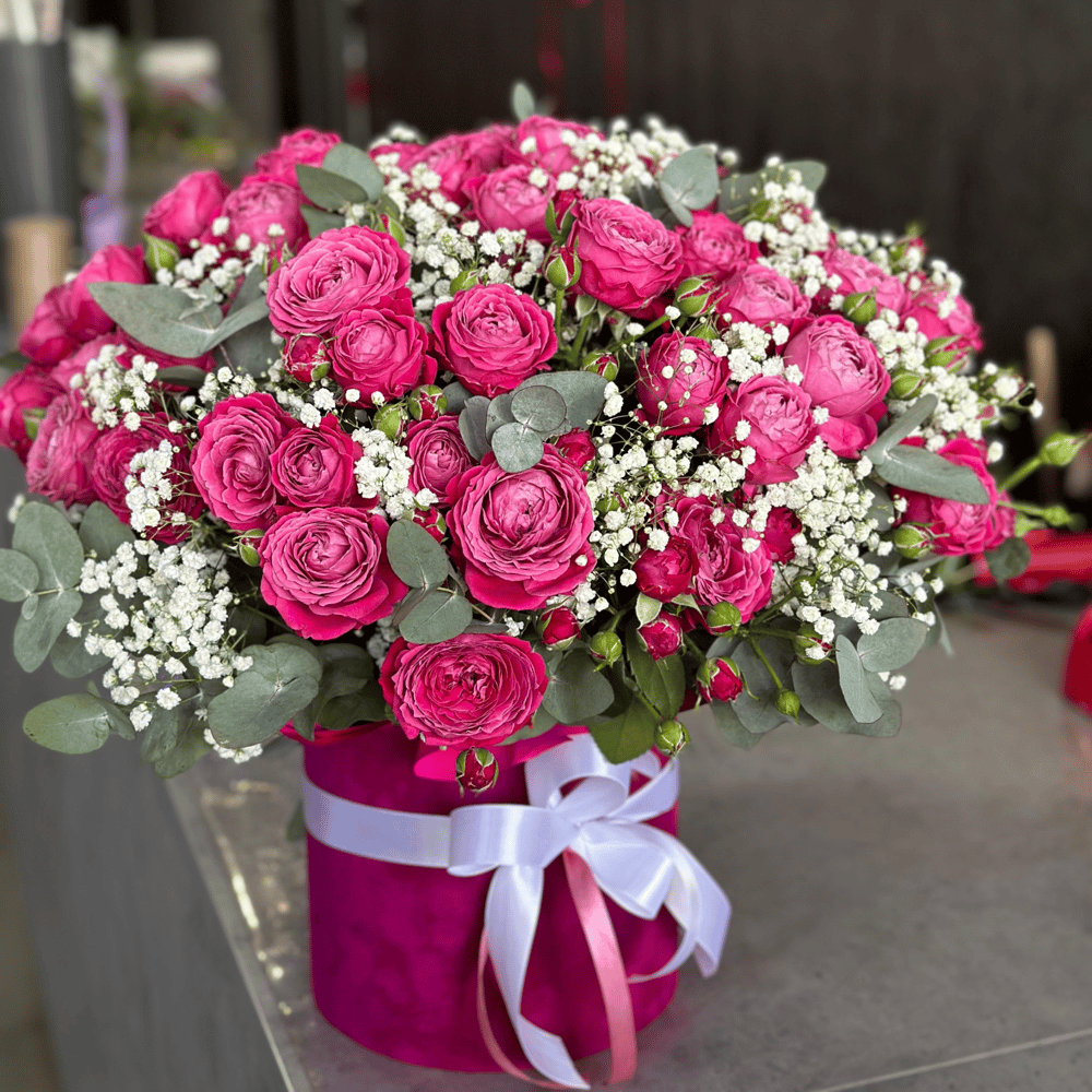 Шляпная коробка с цветами «Кустовые розы и гипсофила в коробке»