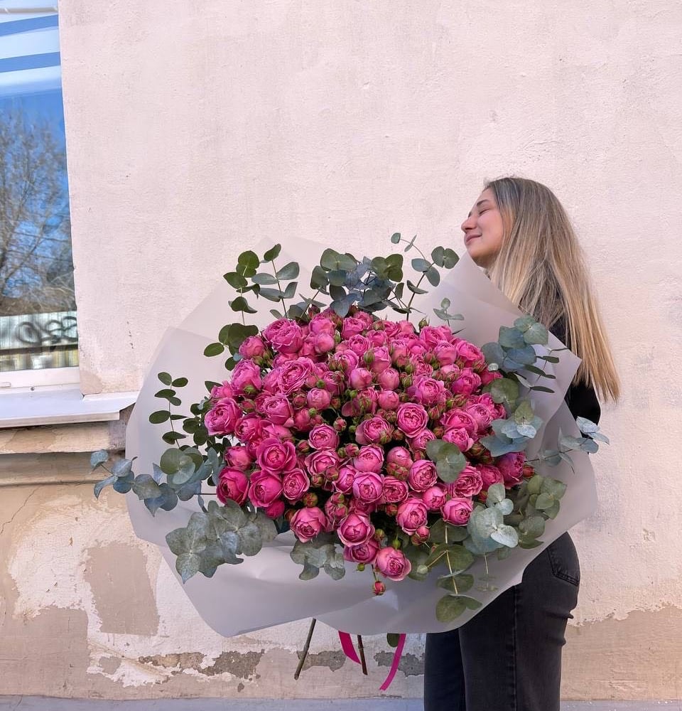 Яркий букет из пионывидных кустовых роз с эвкалиптом, сорта Эквадор в нежной упаковке ❤️ от нас – коробка переноска, открытка с вашими пожеланиями, инструкция по уходу за розами и кризал 🌸 бережная доставка до получателя 🥹