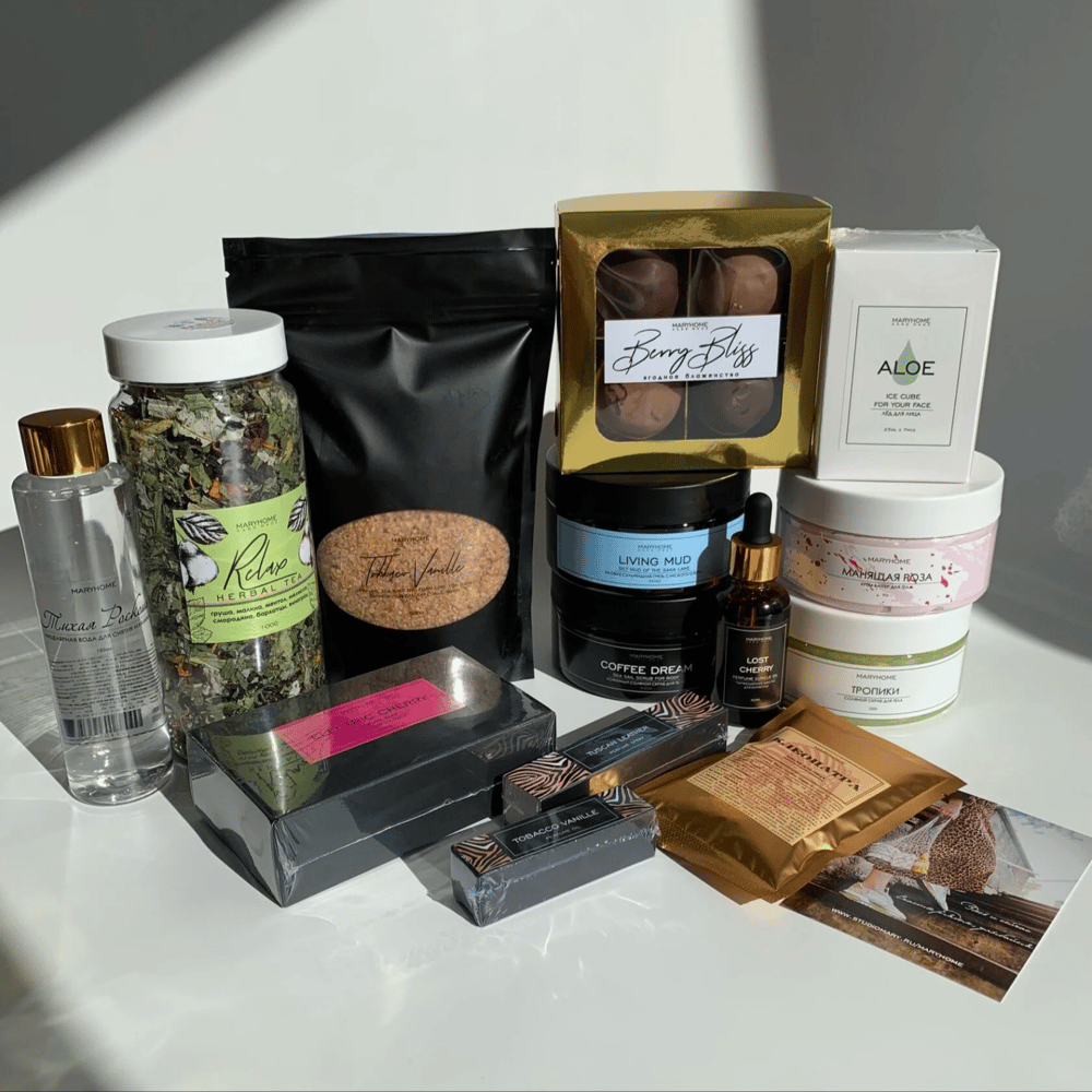 Побалуйте себя приятной покупкой или сделайте подарок близкому человеку. Описание набора: 1. Мицеллярная вода,150мл; 2. Мыло, 105г; 3. Чай в ассортименте; 4. Соль с пеной, 500г; 5. Набор конфет…
