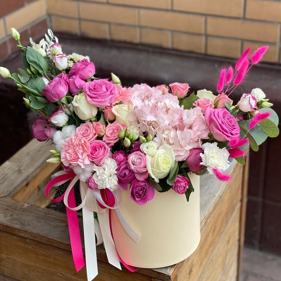 Шляпная коробка с цветами «Ламинуэт» из роз и эустом
