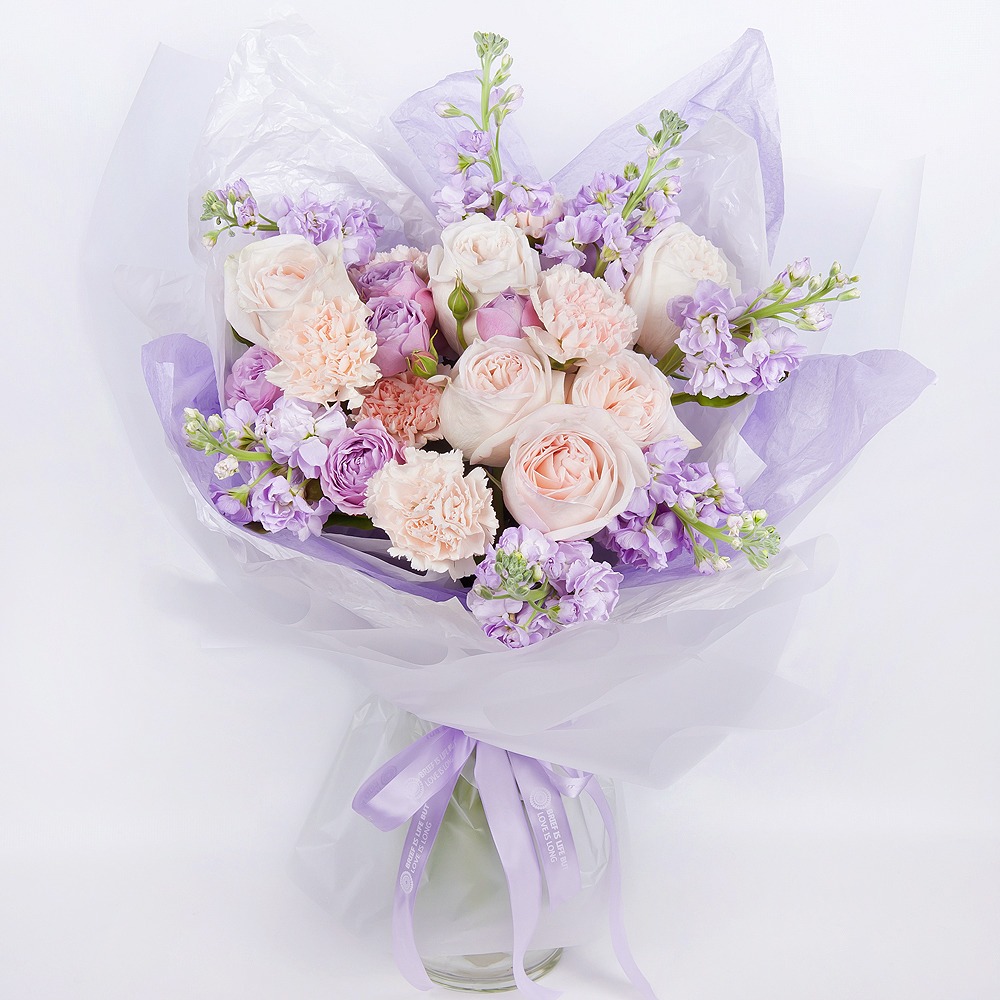Букет «Лавандовая нежность» — воплощение нежности и романтики. В нём сочетаются пионовидные кустовые розы, гвоздики и маттиола, создавая неповторимый лавандовый оттенок. Современная упаковка и пионовидная роза OHara делают этот букет идеальным подарком для любого случая.