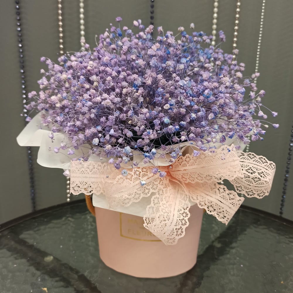 Шляпная коробка с фиолетовой гипсофилой и кружевным бантом - очень нежно и стильно. Композиция долго будет радовать, сначала как живые цветы, затем как сухоцвет. Удобно переносить, не требуется ваза.