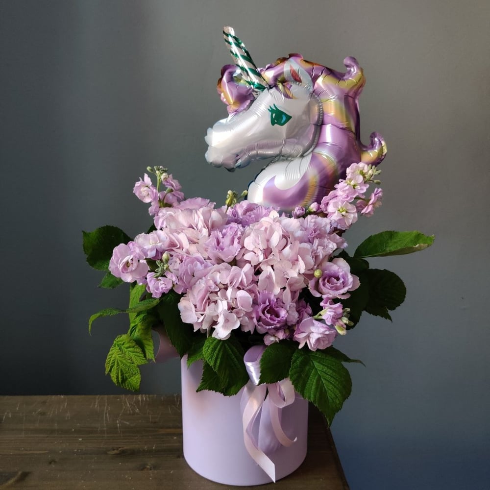 Композиция выполнена в нежной лавандовой цветовой гамме, создавая атмосферу романтики и утонченности. Основу букета составляют пышные соцветия гортензии, которые придают композиции объем и изысканность. Среди гортензий расположены нежные цветы маттиолы с их легким ароматом и изящными формами, а также эустома, добавляющая букету легкости и элегантности. Композиция дополнена ярким элементом — воздушным шаром в форме единорога, который добавляет нотку волшебства и игривости. Вся композиция упакована в дизайнерскую коробку лавандового цвета, украшенную атласными лентами, что подчеркивает ее стиль и завершенность. Этот букет станет прекрасным подарком для особого случая или просто для того, чтобы порадовать близкого человека.