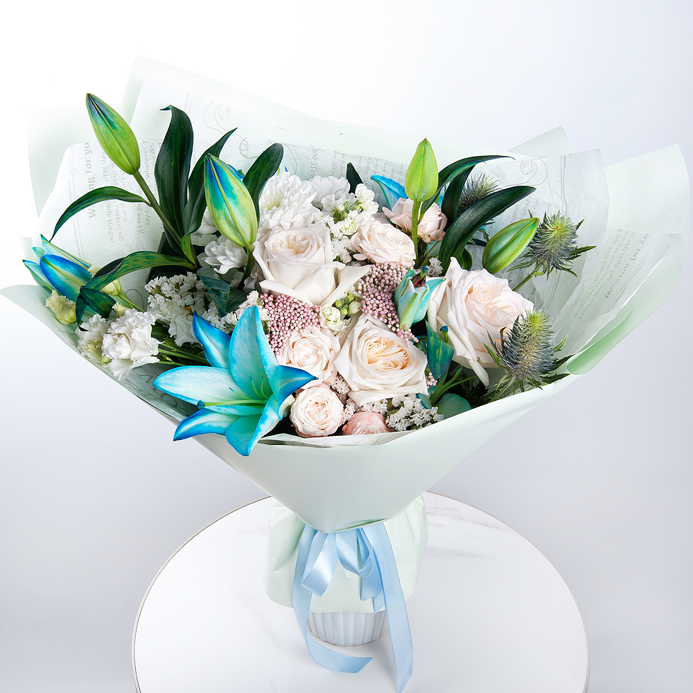Букет «Лазурный восторг» из лилий и экзотических цветов