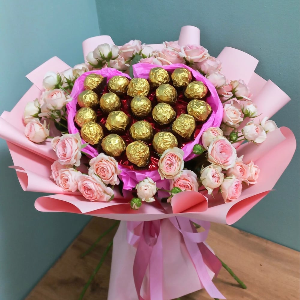 букет из кустовых роз с конфетами в форме сердца