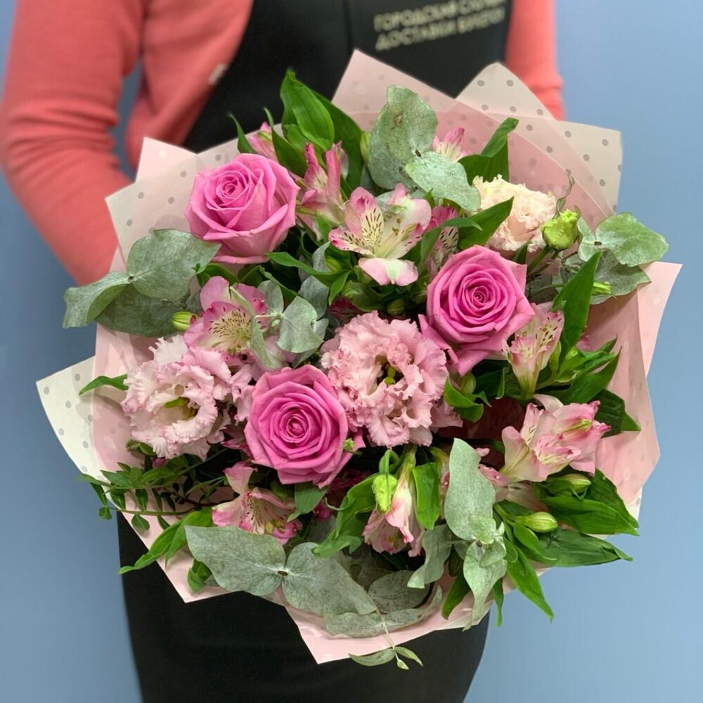 Пышный розовый букет с розами, лизиантусом и альстромерией для создания романтического настроения.