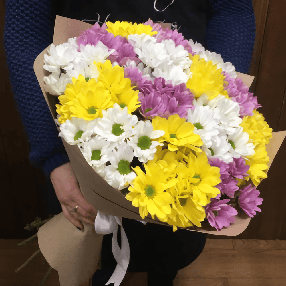 Букет из разноцветной кустовой хризантемы 9 штук, оформленный в фирменную упаковку, перевязан лентой. При отсутствии некоторых видов и расцветки цветов, компания оставляет за собой право осуществить равноценную замену по согласованию с заказчиком» «Каждый букет и композиция может отличаться от исходного варианта, так как каждый букет и композиция уникальны и индивидуальны. Результат будет максимально приближен к образцу.