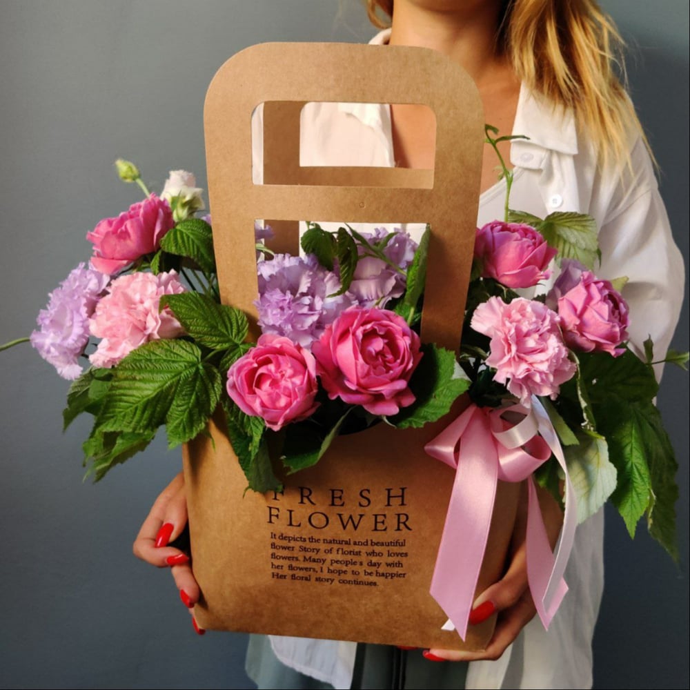 Эта композиция — воплощение нежности и утонченности. Основу букета составляют кустовые пионовидные розы с их пышными бутонами, напоминающими пионы. Их мягкие розовые оттенки создают атмосферу романтики и уюта. Эустома добавляет изысканности и легкости благодаря своим нежным лепесткам, а диантусы с их бархатистой текстурой придают букету особую утонченность. Веточки малины добавляют свежести и природной гармонии, создавая приятный контраст с цветами. Вся композиция аккуратно собрана в стильной сумочке, которая подчеркивает её изысканность. Атласные ленты, завязанные в бант, добавляют букету завершенность и элегантность. Этот букет станет прекрасным подарком для любого случая, выражая ваши чувства и внимание.