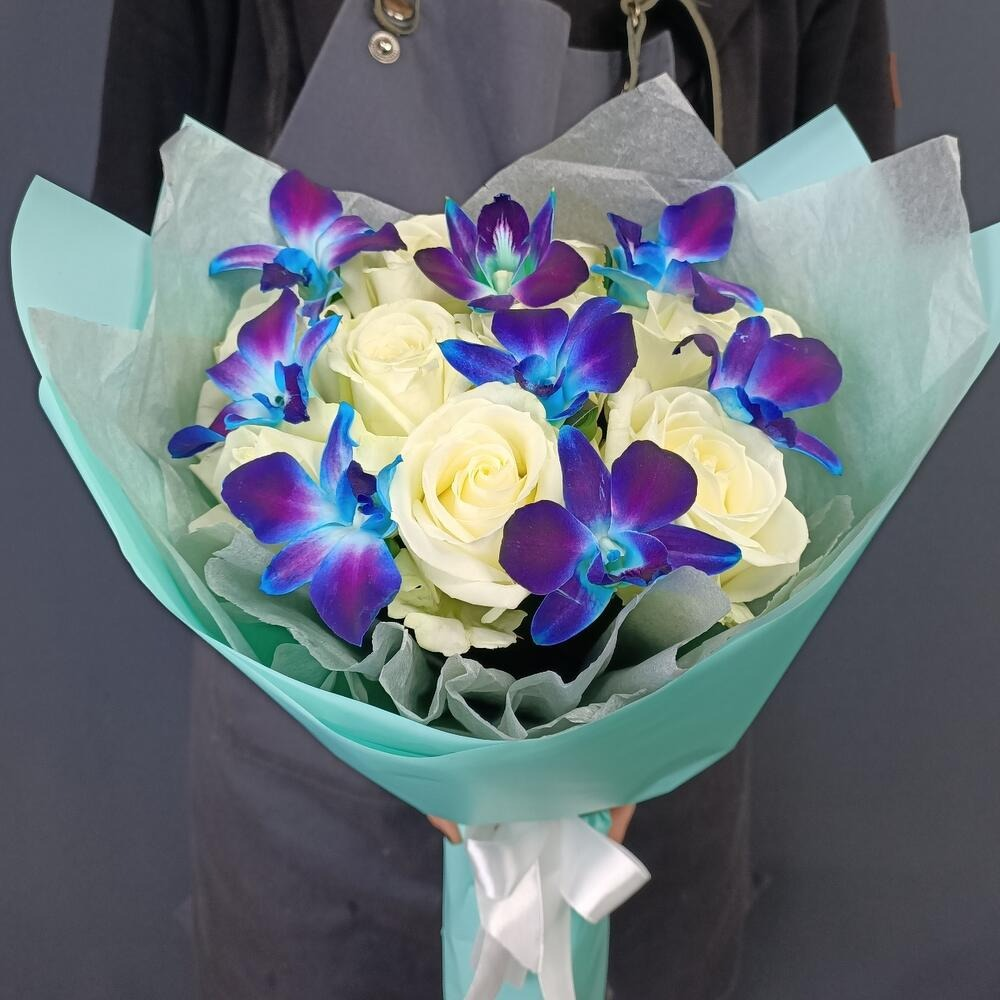 Белые розы и космический дендробиум - прекрасное сочетание, чтобы сделать приятно своим близким