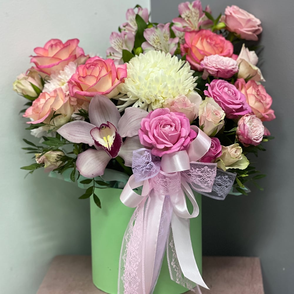 Шляпная коробка с цветами «Летний карнавал» из роз и хризантем