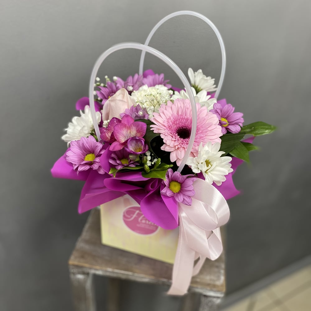 Коробка с цветами «Летний поцелуй» из хризантем и роз