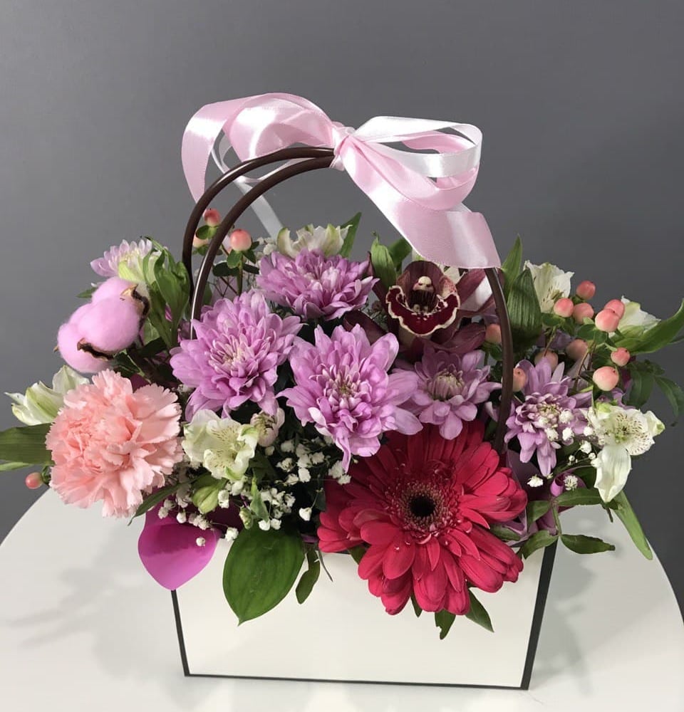 Коробка с цветами «Летний сад» из гипсофил и хризантем
