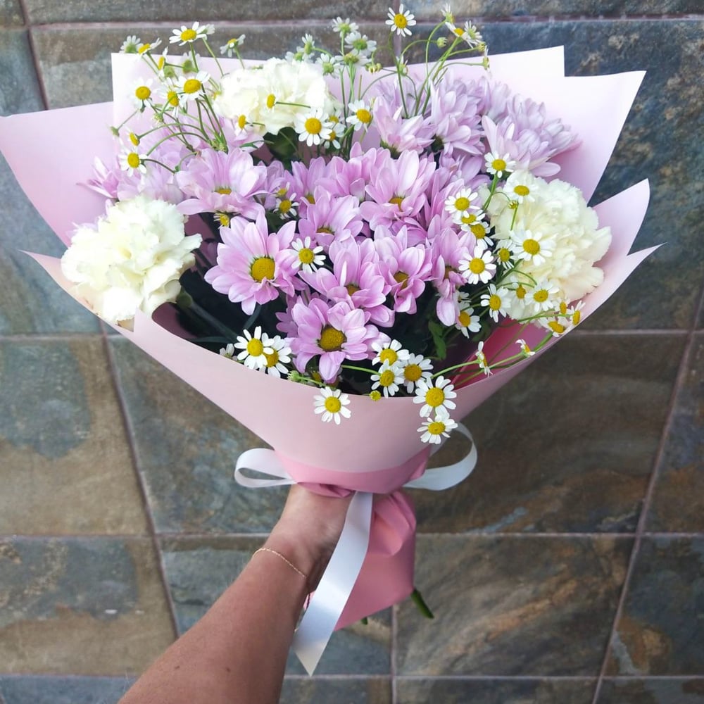 Букет из стойких хризантем, диантусов и танацетума подарят хорошее настроение и порадуют любого получателя!