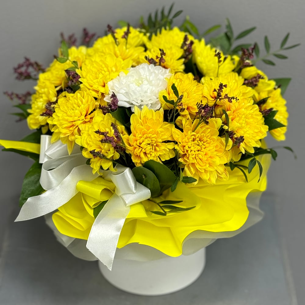 Шляпная коробка с цветами «Летний вальс Татьяны» из хризантем
