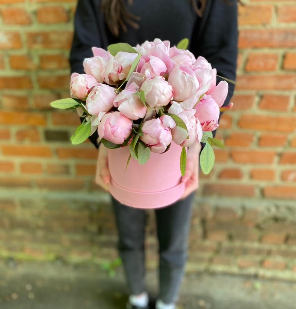 Шляпная коробка с цветами «Летний вечер» из пионов