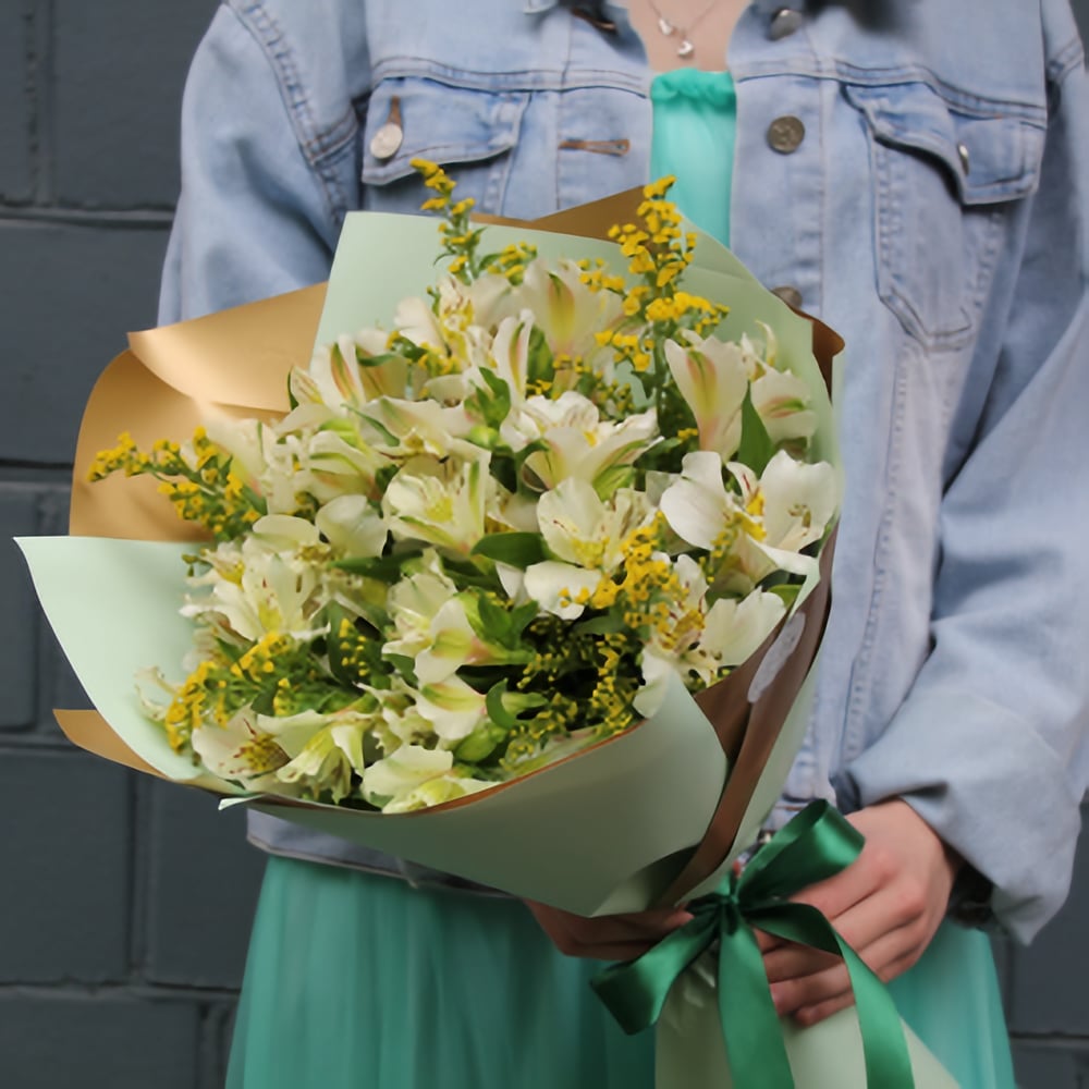 Нежный летний букет из альстрамерий в стильной упаковке подойдет для подарка близким и коллегам