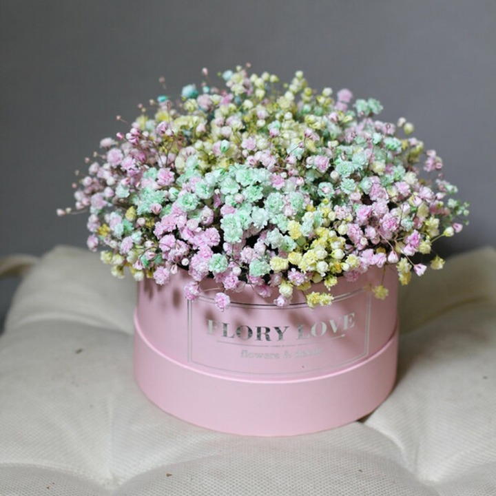 Шляпная коробка с цветами «Летняя радуга. Гипсофила в коробке»