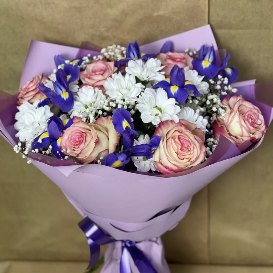 Букет «Летняя свежесть» из ирисов и роз