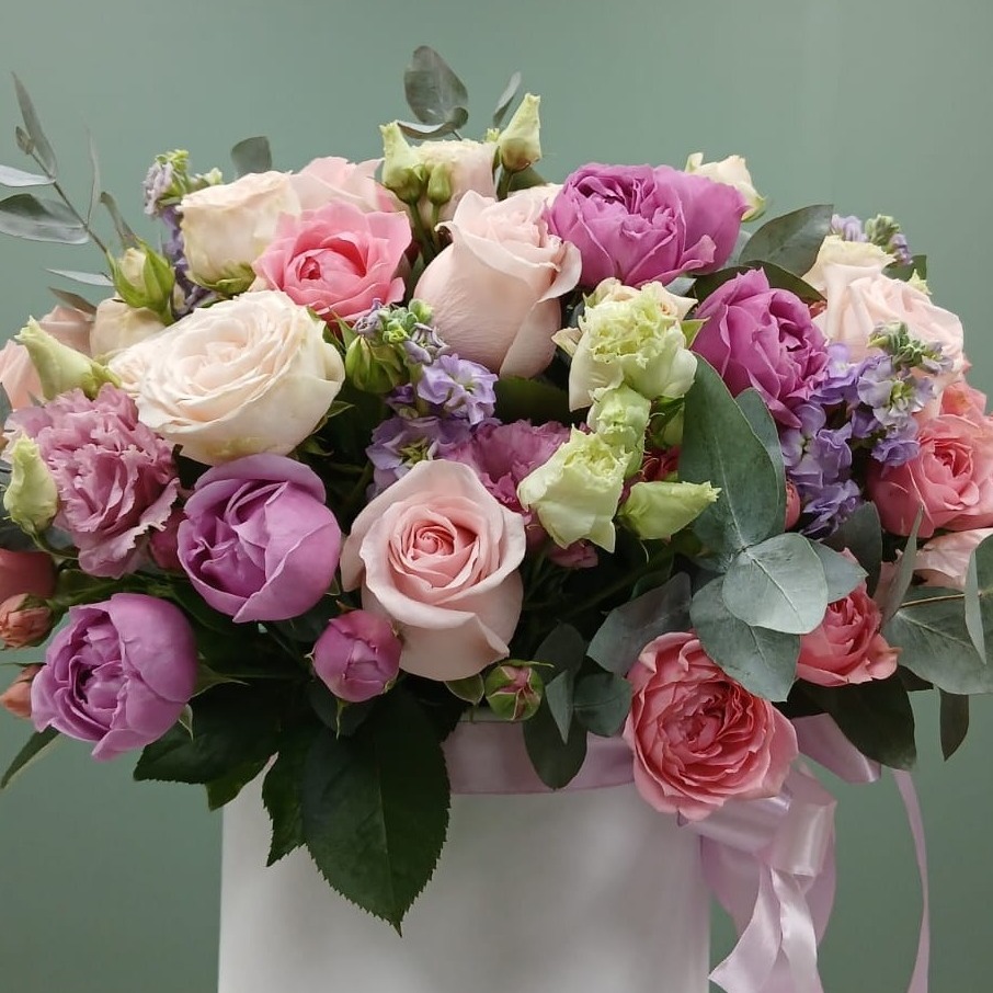 Шляпная коробка с цветами «Лейся песня» из экзотических цветов и эустом