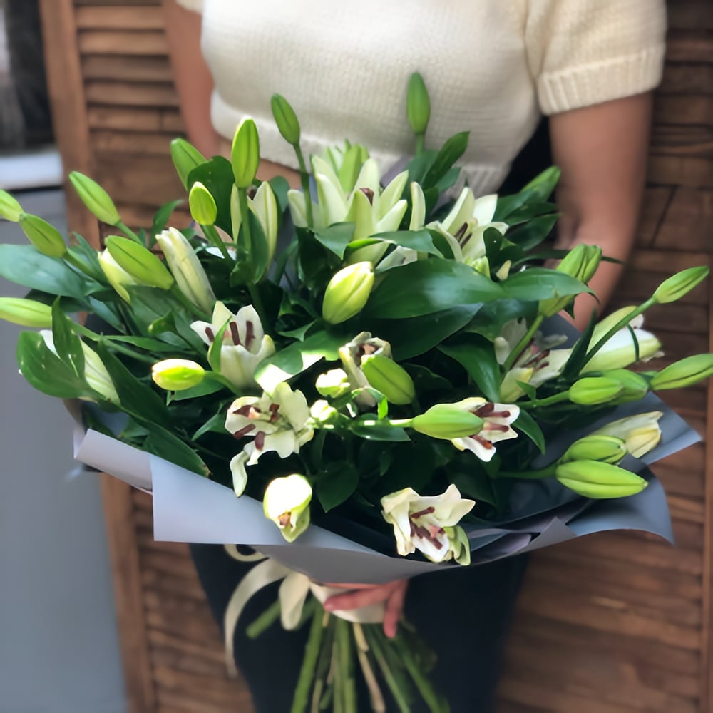 Свежие лилии собраны в потрескивающий букет. Безумно нежные и ароматные цветы.