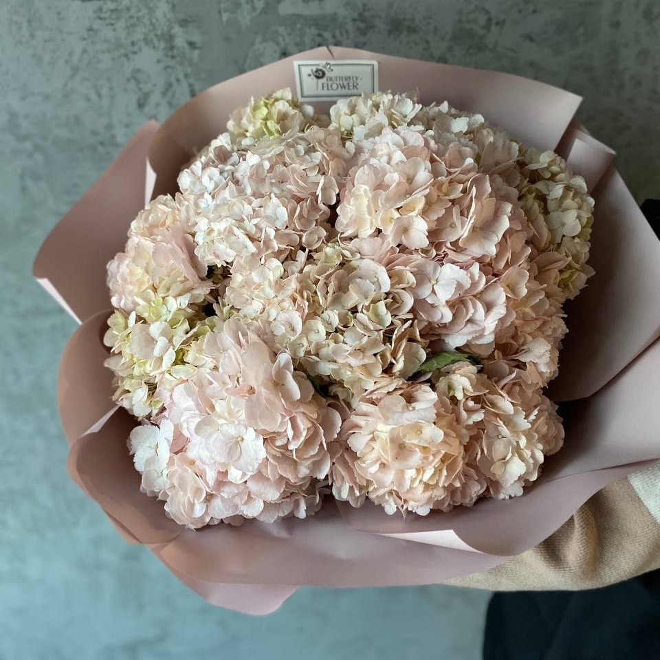 Красивый букет из 11 розовых гортензий в стильной упаковке