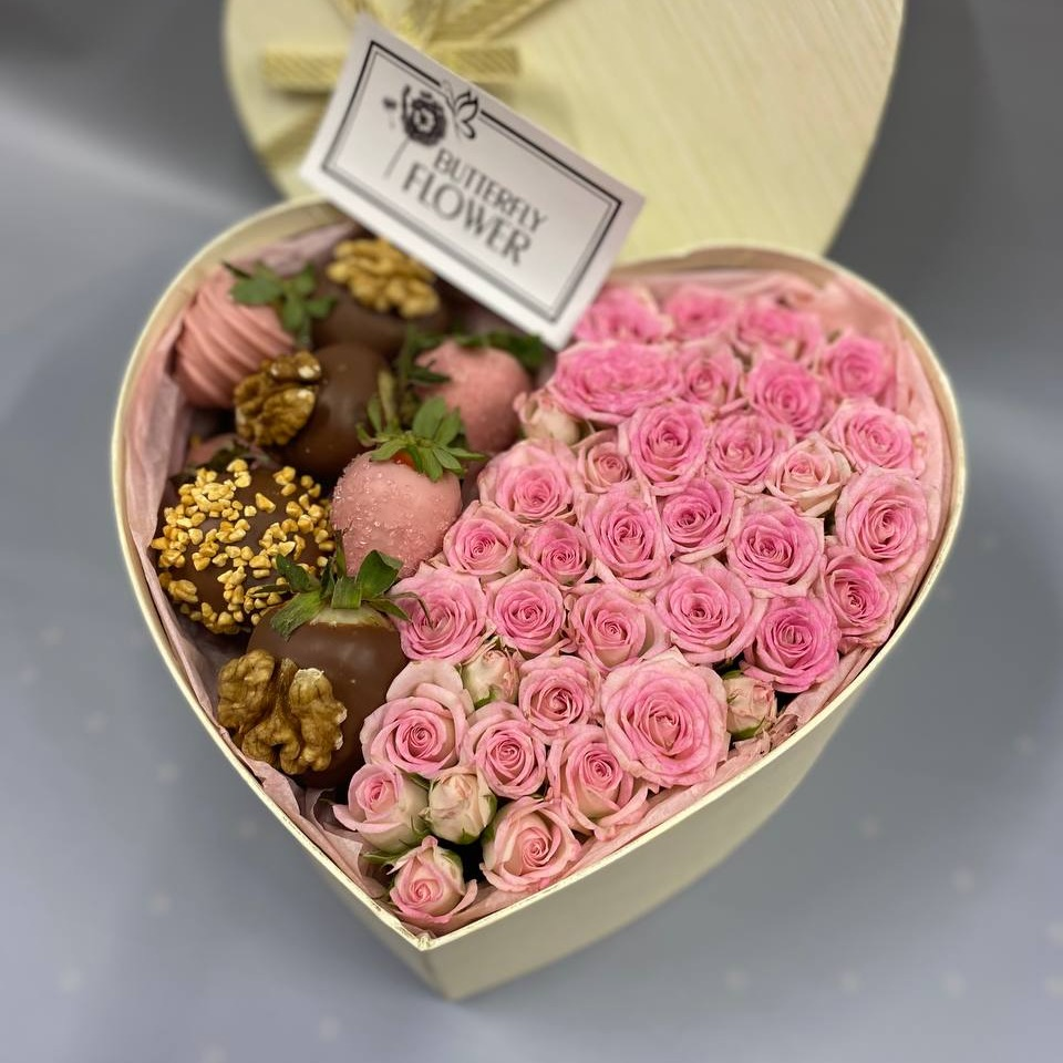 Съедобный фруктовый букет из клубники в шоколаде и кустовых роз в дизайнерской коробке