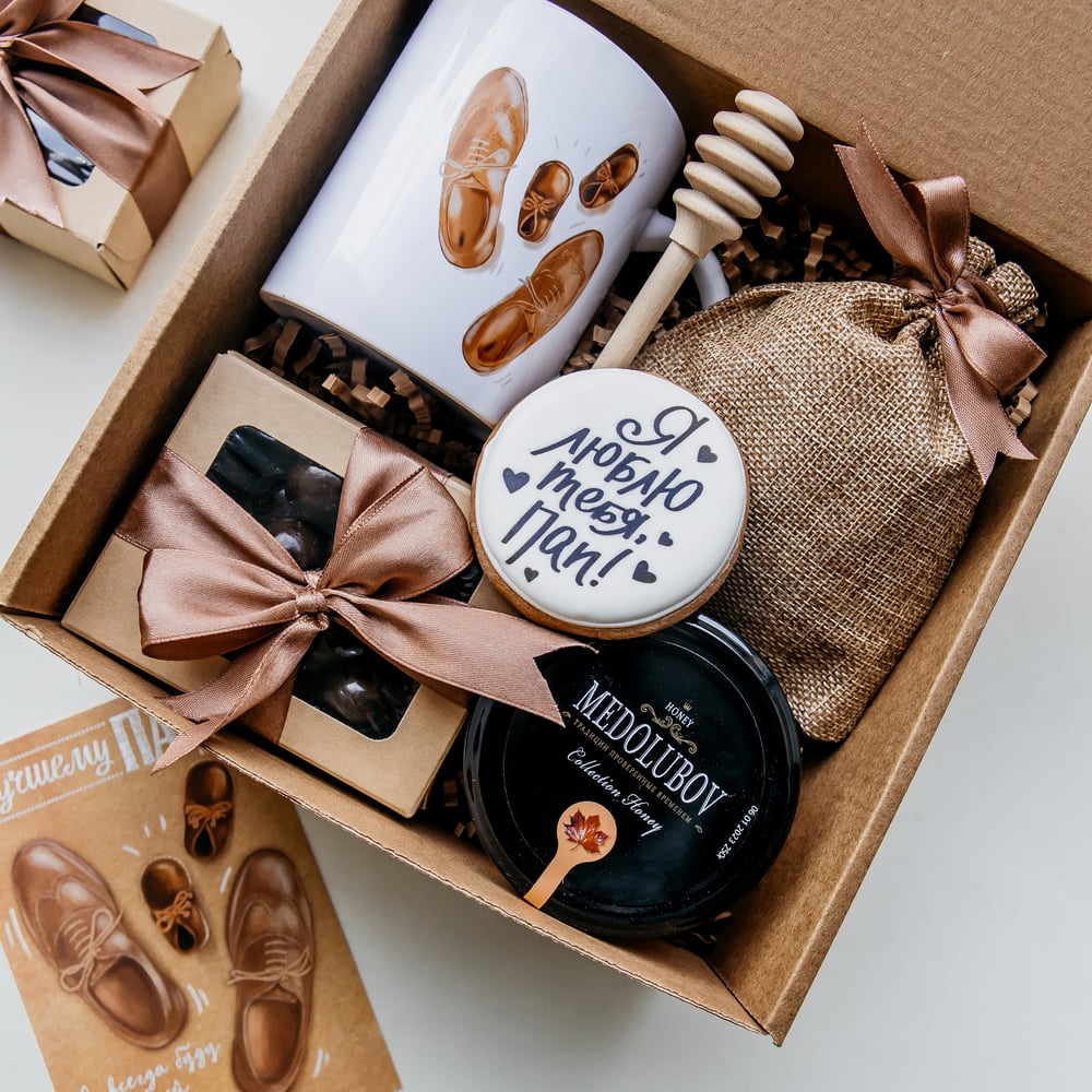 Что внутри? - керамическая кружка с эксклюзивным принтом - ароматный крупнолистовой чай "Лесные ягоды" - ассорти орехов в темном шоколаде, 150 гр. - мед, 250 гр. - медовый пряник - открытка на выбор - оформление в крафтовой коробочке 20х20 см - украшена коробочка атласной лентой и бантом Готовый подарок для самого родного и близкого человека. Красивая керамическая кружка, будет радовать любимого папу, долгие годы напоминая ему о Вас. Ароматный черный чай лесные ягоды и мед – согреют и окутают теплом. Фундук в темном шоколад и пряник ручной работы, вкусные и полезное дополнение к подарку