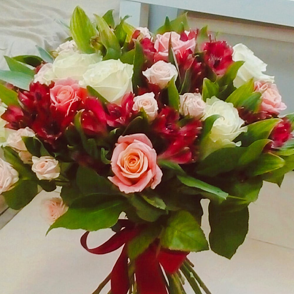 Интересный букет из роз и альстромерий, выполнен без упаковки.
