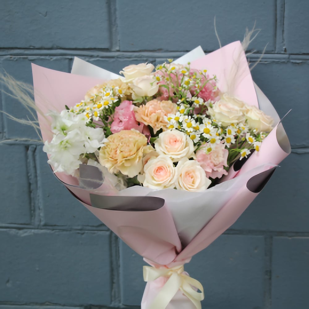 Нежный летний букет с ароматной ромашкой и постельными кустовыми розами подойдет для подарка близким и коллегам.