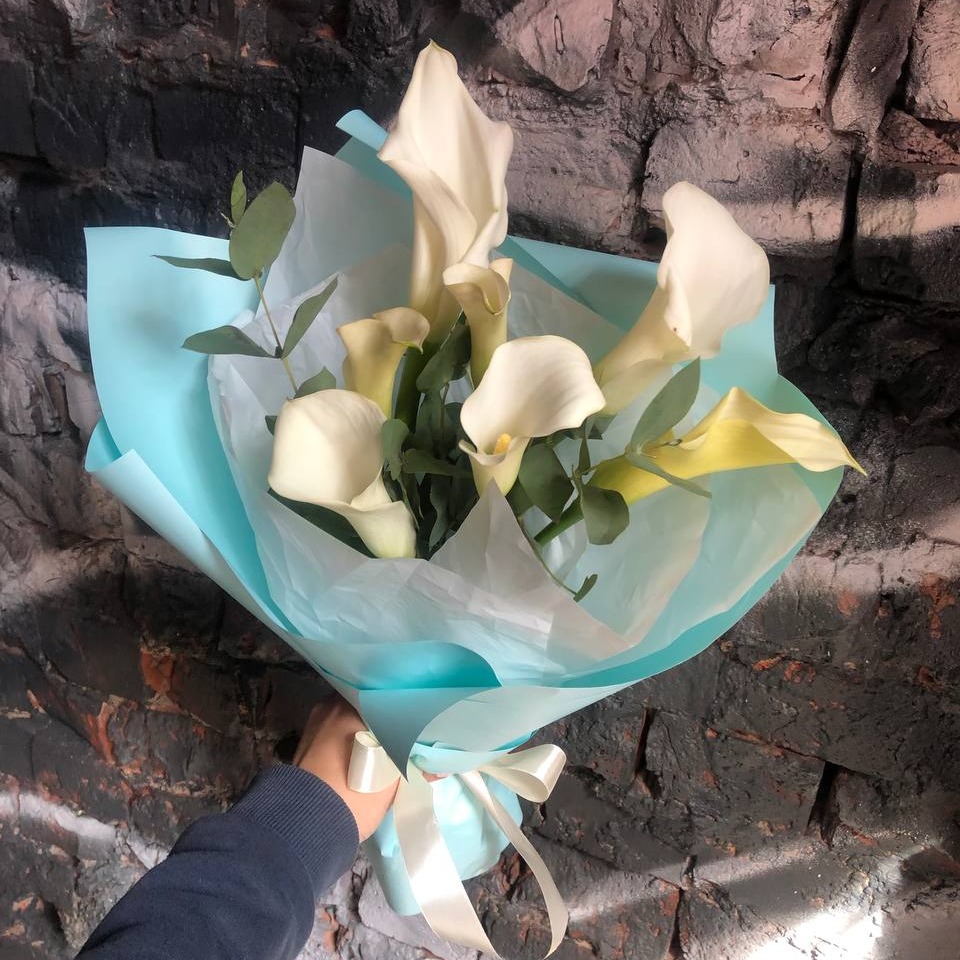 Букет из 7 белых калл с эвкалиптом в стильной упаковке
