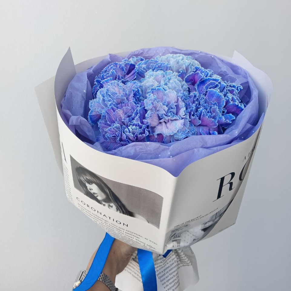Букет выполнен из 11 диантусов. Упаковка лавандовый тишью и дизайнерская бумага. Размер букета 30×50